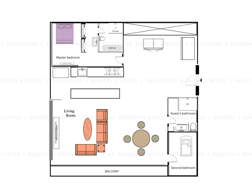 ภายในคอนโดมีการออกแบบแปลนแบบเปิด (Open-plan layout) เชื่อมต่อระหว่างพื้นที่ห้องนั่งเล่น ห้องรับประทานอาหาร และห้องครัวอย่างลงตัว ห้องครัวสไตล์โมเดิร์นมีอุปกรณ์ครบครัน ไม่ว่าจะเป็นเคาน์เตอร์ครัว เกาะกลางเตรียมอาหาร เตาอบ และตู้เย็น เหมาะสำหรับการทำอาหารและสังสรรค์ ห้องนอนที่สองเหมาะสำหรับเตียงเดี่ยวหรือเตียงขนาด 3 ฟุต โดยห้องน้ำสำหรับแขกตั้งอยู่ใกล้ห้องนั่งเล่นเพื่อการใช้งานที่สะดวก
