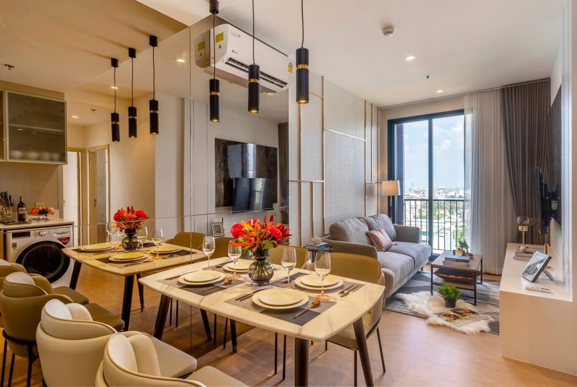 การตกแต่งภายในเน้นความอบอุ่น ทันสมัย ด้วยโทนสีไม้ธรรมชาติ แสงไฟนุ่มนวล และเฟอร์นิเจอร์โทนเรียบหรู พื้นที่นั่งเล่นจัดสรรอย่างลงตัว พร้อมโซฟานุ่มสบาย ทีวีจอแบนติดผนัง และประตูกระจกบานเลื่อนที่เปิดสู่ระเบียงส่วนตัวพร้อมวิวเมืองโล่ง พื้นที่รับประทานอาหารเชื่อมต่อกับครัวเปิด ซึ่งมีครบทั้งตู้เก็บของ, ตู้เย็น, เตาไฟฟ้า, ไมโครเวฟ และเครื่องซักผ้าอบผ้าในตัว