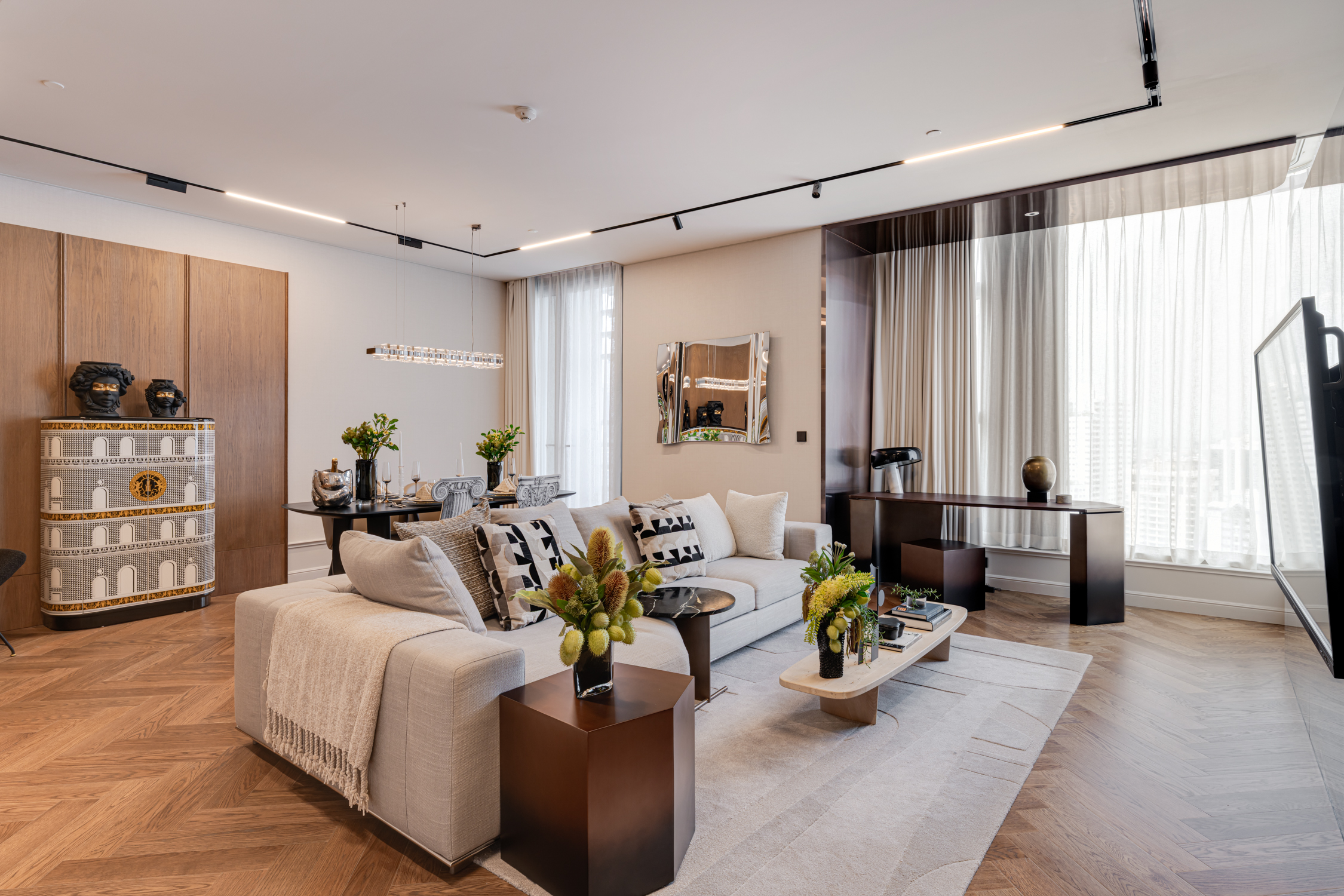 The interior showcases Thai–French contemporary aesthetics, featuring premium materials, elegant marble finishes, warm wood flooring, and thoughtful spatial planning. Every corner reflects understated luxury while remaining highly functional for daily living.