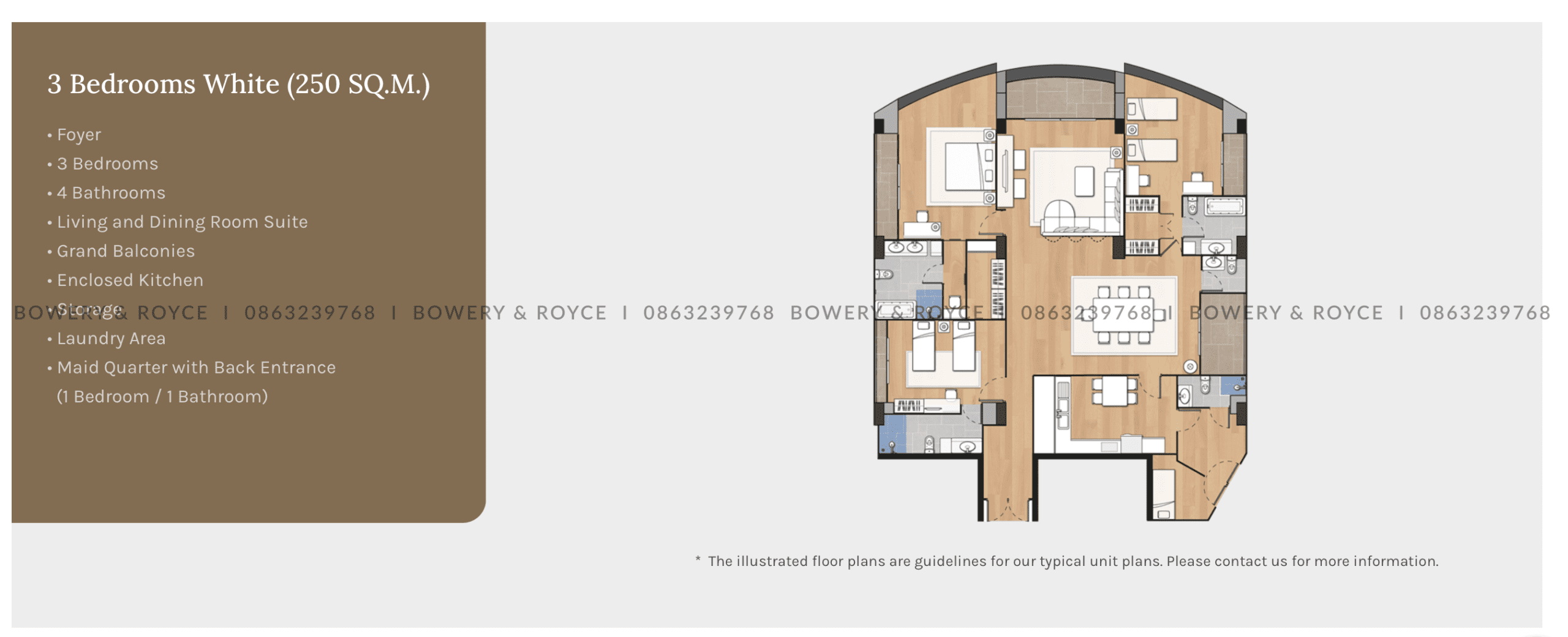 Features included 3 bedroom with balconies, 4 bathrooms, living, family and dining area with balconies, maid’s room with attached bathroom and separate entrance, wash area. Fully equipped modern kitchen attached storage room, American standard bathroom fittings, air-conditioner, smoke detector and water sprinkler in all rooms.